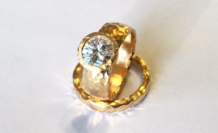 24K yellow gold hammered wedding ring set with bezel set Diamond